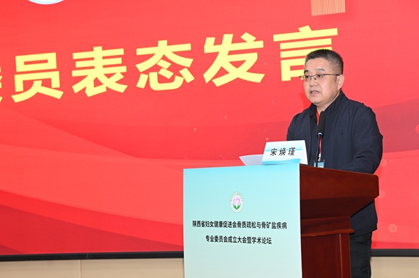 新当选的主任委员宋焕瑾教授作表态发言。他表示,当选主任委员既是荣誉更是责任,未来将带领专委会全体委员,重点开展四方面工作:一是搭建高水平学术交流平台,定期举办学术会议、专题研讨,促进多学科交叉融合;二是推进人才培养工程,通过培训班、进修学习等方式提升基层诊疗能力;三是推动医教研用深度融合,加速科技成果落地转化,加速骨质疏松防治新技术、新药物、新设备的研发与转化应用;四是深化科普宣传行动,走进社区、校园、乡村开展健康讲座和义诊活动,提高女性群体的疾病认知和预防意识。宋教授同时提到,专委会将积极开展临床研究,推广先进防治技术,力争形成具有陕西特色的防治经验。